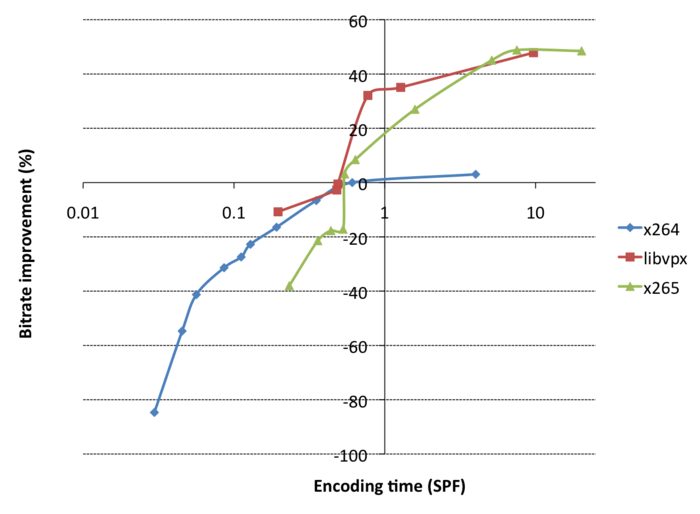 > red line (libvpx) vertically above it, the bitrate improvement normalized for CPU usage is only 20-30%. For