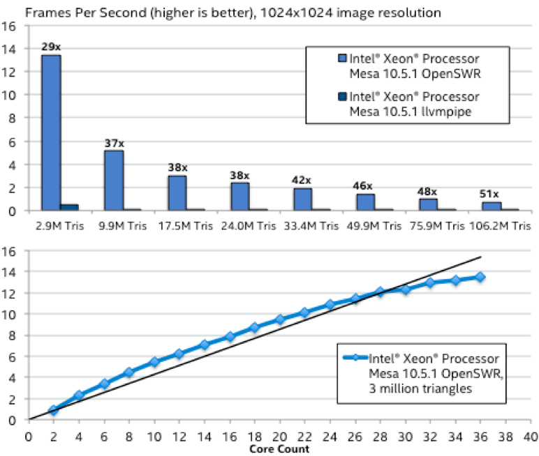 > ... По сравнению с ныне применяемым в Mesa программным растеризатором LLVMpipe, решение от Intel обеспечивает прирост производительности в 29 раз при расчёте сцены из 2.9 млн треугольников и в 51 раз на сцене в 106.2 млн треугольников