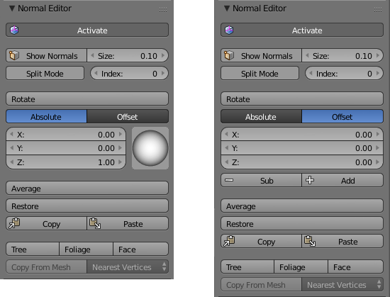 - Улучшен редактор нормалей. Добавлен режим относительного редактирования нормалей (Offset). Операция Average теперь может применяться к неразделённым нормалям. Также была добавлена возможность ручного ввода угла поворота нормали, аналогично тому, как это делается для поворота обычных объектов в Blender.