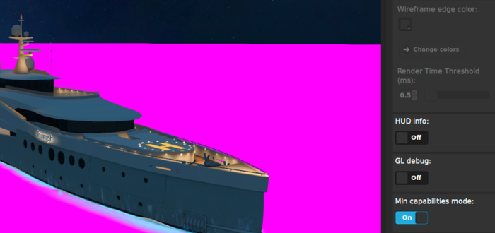 - Улучшен интерфейс просмотрщика сцен Viewer. На панель "Tools & Debug" добавлена кнопка "Min capabilities mode". Этот параметр заставляет просмотрщик сцен воспроизводить загруженную сцену так, как если бы она работала на системе с низкой производительностью (например, на iOS-устройстве). Это позволяет узнать, какие материалы в сцене могут работать не так, как задумано, на системе с низкой производительностью.