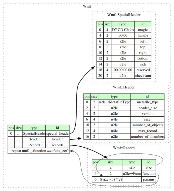 2. Реагировать на провалившиеся проверки. Это сложнее, тут надо думать. Самое тупое решение в лоб - провалившаяся проверка выкидывает exception - дальше вызывавший его код ловит и делает какие-то действия по восстановлению, если сочтет нужным, сам. Например, двигается куда-то по стриму и вызывает парсинг повторно. Варианты автоматизации и реализации таких действий внутри ksy надо продумывать. Очевидные варианты типа "сдвинуться на +1, +n, (+n) % m байт и попробовать заново" в принципе можно описать, но иногда бывают и куда более хитрые алгоритмы восстановления, синхронизации и realingment. Например, с откатом назад и особенно противно - с полноценным backtracking, когда надо перепарсить все на несколько уровней вверх, приняв альтернативную парадигму.