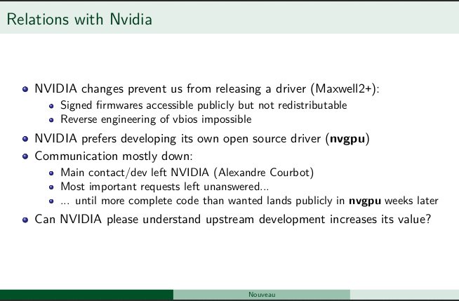 >> Обсудить возможные пути решения проблем не получается, так как из компании NVIDIA уволился разработчик Alexandre Courbot, отвечавший за взаимодействие с открытыми проектами и канал связи с NVIDIA оказался практически разорван.
