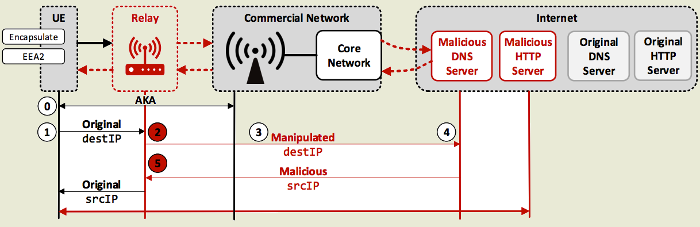 >В частности, данные в LTE шифруются с использованием алгоритма >AES-CTR, работающего в режиме счётчика, но без применения средств для >контроля целостности блоков. Отсутствие контроля целостности позволяет >подменить шифротекст. В частности, в AES-CTR шифротекст формируется >путём применения операции XOR между ключевой последовательностью >keystream) и исходными данными.