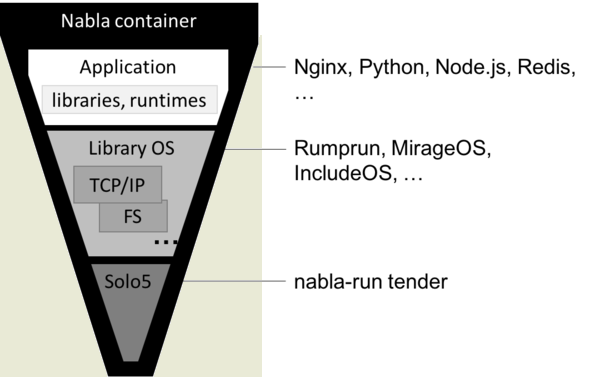 В качестве основы в окружениях Nabla задействованы наработки открытого компанией IBM проекта Solo5, предоставляющего изолированное окружение для запуска произвольных unikernel, в том числе развиваемых проектами Rump, MirageOS и IncludeOS. Вся необходимая системная функциональность прикрепляется к приложению во время сборки. Среди протестированных приложений Nginx, Python, Redis и Node.js, для которых подготовлены типовые образы контейнеров. Для запуска контейнеров применяется runtime runnc (переработанный runc), интегрируемый с инструментарием Docker и совместимый со спецификацией