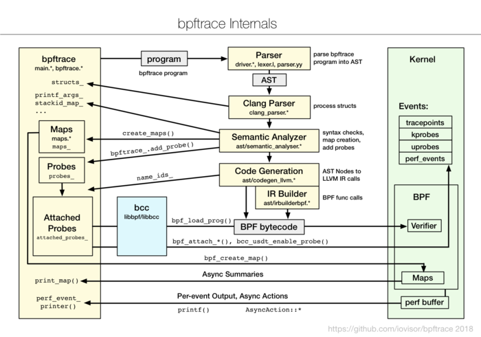 Возможна привязка скриптов-обработчиков к функциям ядра (kprobe:vfs_read), функциям в пространстве пользователя (uprobe:/bin/bash:readline), точкам трассировки в ядре (tracepoint:sched:sched_switch), программным и аппаратным событиям (software:faults: и hardware:cache-references:). Возможен периодический запуск скриптов для сбора статистики (profile:ms: и interval:ms:). Поддерживается привязка скрипта сразу к нескольким событиям, привязка по маске (kprobe:vfs_*) и определение условий для вызова (kprobe:sys_open / uid == 0 /). Для использования в скриптах предлагается типовой набор функций и библиотека готовых обработчиков на основе BCC (BPF Compiler Collection).