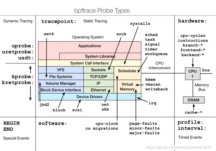 eBPF представляет собой встроенный в ядро Linux интерпретатор байткода, позволяющий создавать обработчики сетевых операций, отслеживать работу систем, перехватывать системные вызовы, контролировать доступ, обрабатывать события с сохранением хронометража (perf_event_open), подсчитывать частоту и время выполнения операций, выполнять трассировку с использованием kprobes/uprobes/tracepoints. Благодаря применению JIT-компиляции, байткод на лету транслируется в машинные инструкции и выполняется с производительностью нативного кода. BPFtrace пока ограничен поддержкой платформы Linux, но
