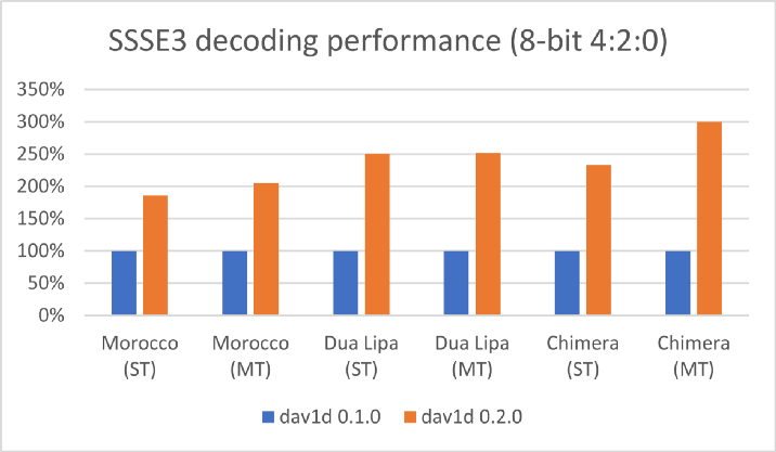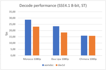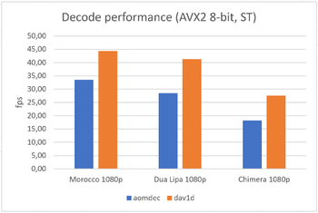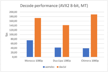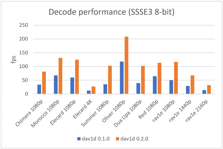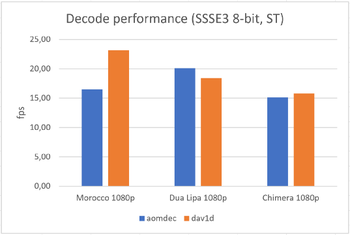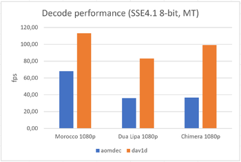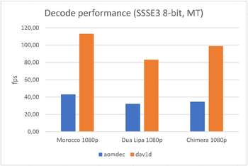 Цитата: "В целом dav1d теперь обеспечивает производительность, достаточную для декодирования видео 1080p с частотой 30 кадров в секунду практически на любых процессорах с поддержкой SSSE3"