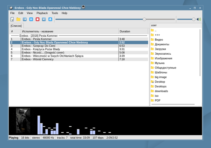 Приличный плеер, но из-за кутей довольно неповоротливый. Лучшие плееры были на GTK2 в этом плане.