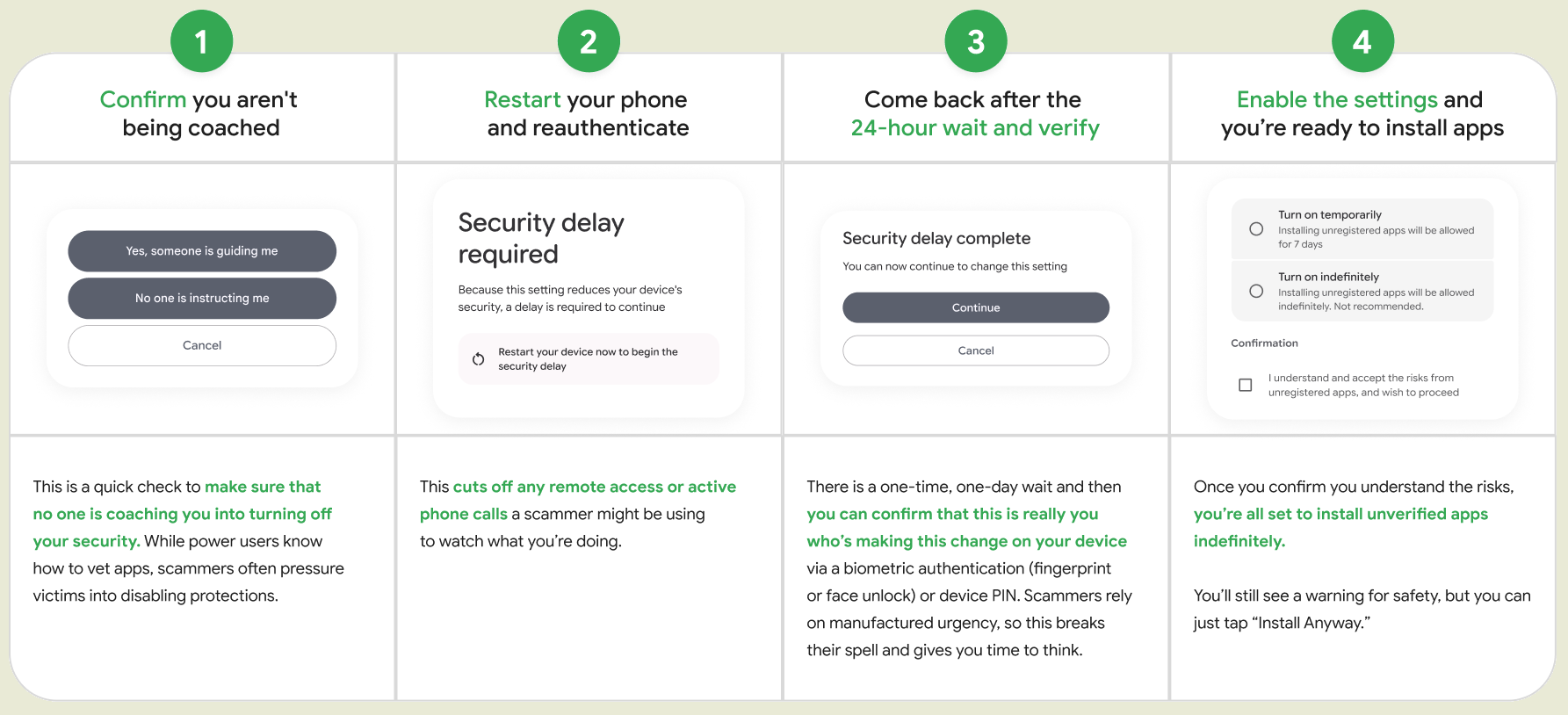 - Возможность установки вручную загруженного пакета будет активирована через 24 часа, что даст пользователю время на осознание ситуации, если он находится по влиянием мошенников. Через 24 часа пользователь должен повторно зайти в настройки и подтвердить, что он сознательно активировал режим для установки сторонний пакетов, используя PIN-код или биометрическую аутентификацию.