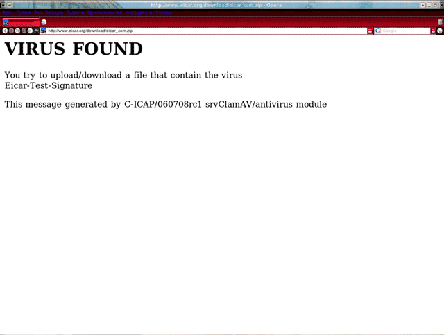 страница с тестовыми вирусами, результат обнаружения вируса показан на