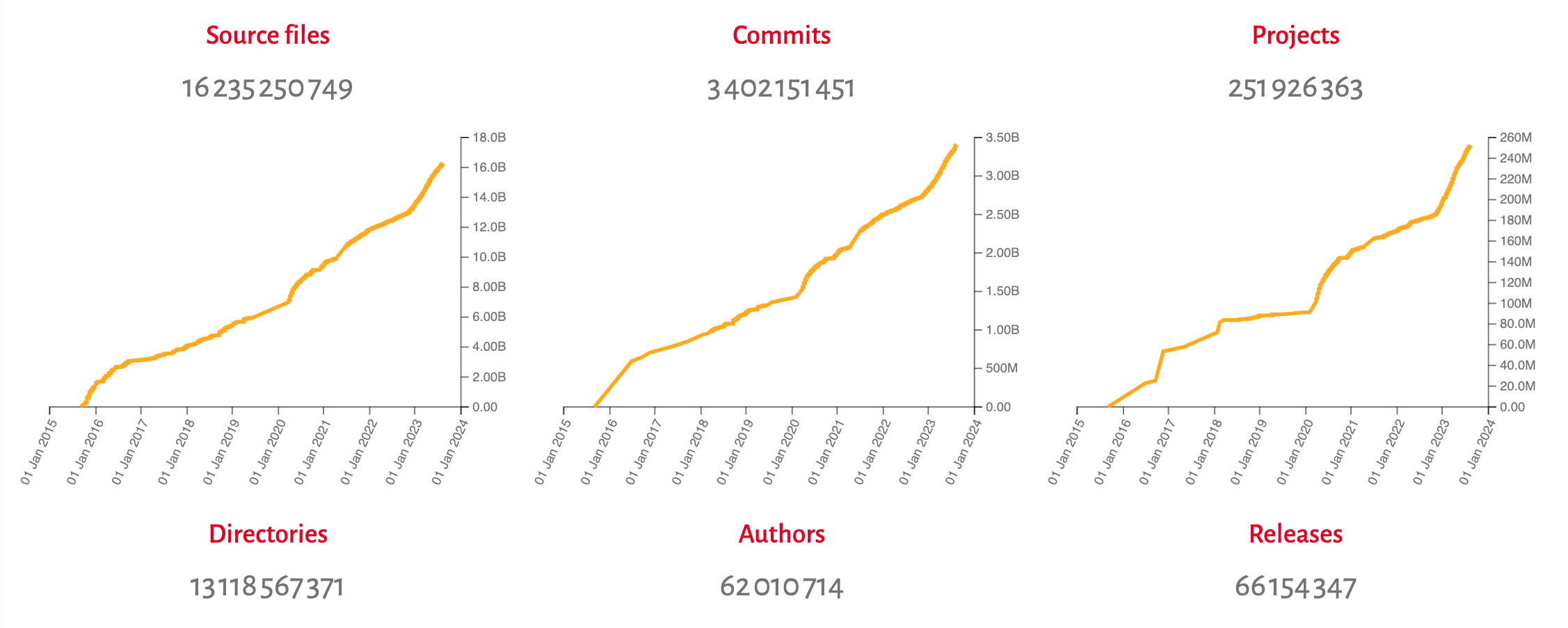 В настоящий момент архив (https://www.softwareheritage.org/archive/) включает более 2.6 миллиарда файлов, охватывающих 23 миллиона открытых проектов и почти 600 млн коммитов. Архив включает код, размещённый в GitHub, в репозиториях Debian, коллекциях GNU и в других публичных архивах. Налажен процесс автоматической синхронизации изменений с GitHub, который скоро будет реализован и для других источников. Для запроса файлов пока можно использовать только контрольные суммы SHA-1.
