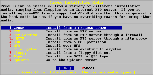 Если установка будет производится с cdrom, выбирете опцию "Install from a FreeBSD CDROM". Затем выбирите [OK] и нажмите ENTER для запуска процедуры установки.
