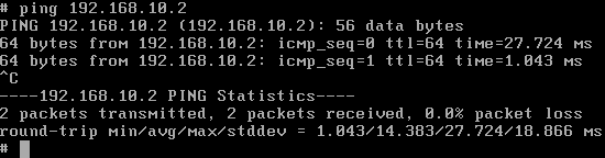DHCP сервер на основе FreeBSD работающий по адресу 192.168.10.2, выделил мне адрес 192.168.10.128. Ответив "Yes" на вопрос о том, верно ли проведено конфигурирование сетевой карты, я решил проверить, насколько правильно она будет после этого работать. Пользуясь меню, о котором мы говорили ранее, запустил оболочку /bin/sh. Затем с помощью команды ping попытался посмотреть, доступен ли наш DHCP сервер. Также по совместительству он является DNS сервером и шлюзом по умолчанию.