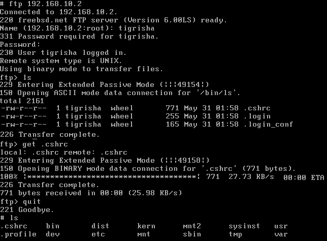Как видите, сервер оказался доступен. Окрыленный таким успехом, я решил проверить другие протоколы и для этого воспользовался ftp сервисом, работающим на том же сервере. Авторизовавшись, скачал из домашней директории пользователя tigrisha файл .cshrc. Убедился, что файл появился в локальной файловой системе.