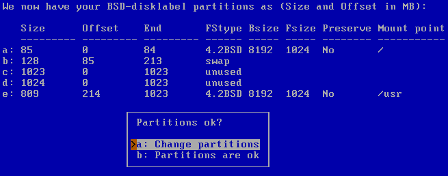 У меня ничего ценного на этом диске отродясь не водилось, поэтому было решено полностью использовать доступное пространство, которое было равно 1023,97 мегабайт. Следует отметить, что NetBSD для исправного функционирования довольствуется гораздо более скромным пространством. Инсталляция всех пакетов плюс система X Windows займет 290 мегабайт, а без него 200 мегабайт. Следующий вопрос, заданный системой, уточняет тип разбиения диска на файловые системы.