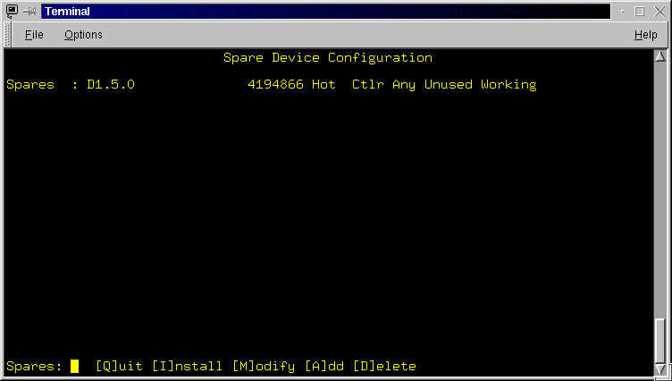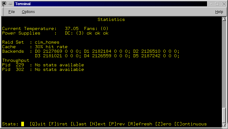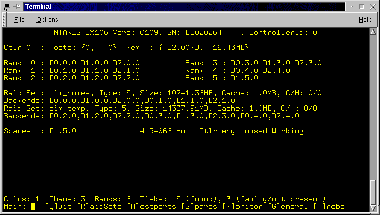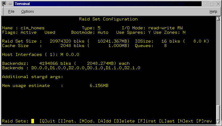 The next set of lines provide a summary of the Raid Sets configured on the RaidRunner. The summary includes the raid set name, it's type, it's size, the amount of cache allocated to it and a comma separated list of it's backends. See rconf in the "Advanced Topics" section for a full description of the above.![]()