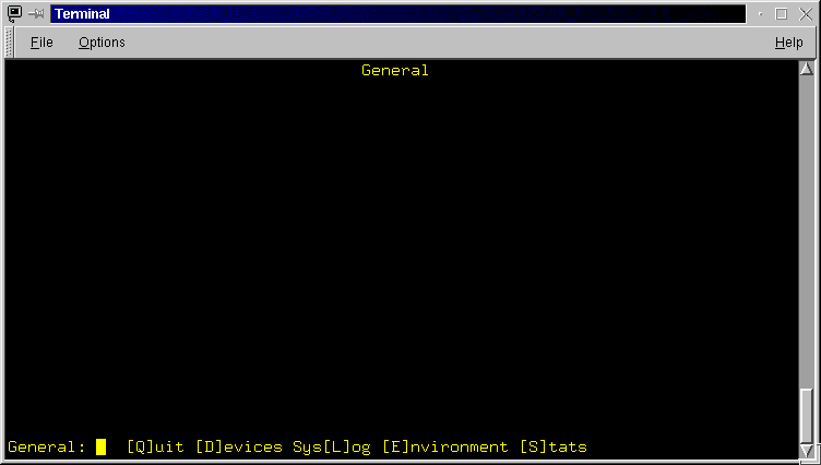 Figure 3.6: The General Screen. The options accessible from here allow you to view information on the attached devices (SCSI hard drives and tape units), browse the system logs, and examine environment variables.