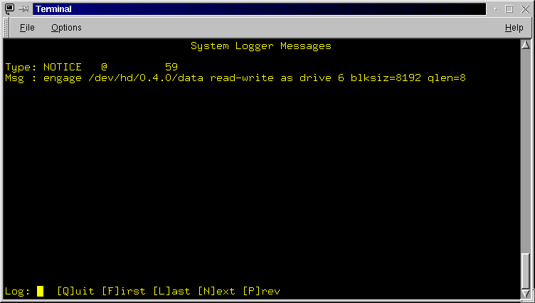 Figure 3.9: The system logger messages screen. An example message is shown, there is one message per screen.