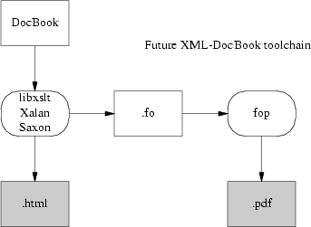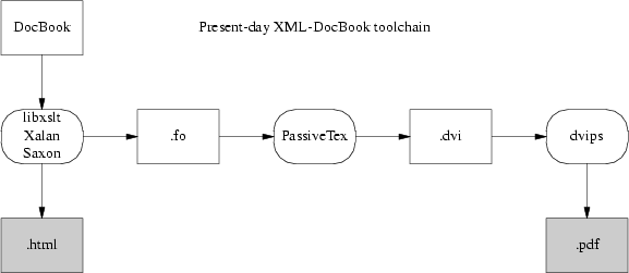 So, first, a stylesheet translates Docbook's structural markup into another dialect of XML — FO (Formatting Objects). FO markup is very much presentation-level; you can think of it as a sort of XML functional equivalent of troff. It has to be translated to Postscript for packaging in a PDF.