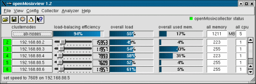 openMosixview displays a row with a lamp, a button, a slider, a lcd-number, two progressbars and some labels for each cluster-member. The lights at the left are displaying the openMosix-Id and the status of the cluster-node. Red if down, green for avaiable.