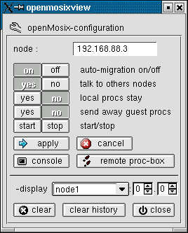 The openMosix-configuration of each host can be changed easily now. All commands will be executed per "rsh" or "ssh" on the remote hosts (even on the local node) so "root" has to "rsh" (or "ssh") to each host in the cluster without prompting for a password (it is well described in a beowulf documentation or on the HowTo's on this page how to configure it).