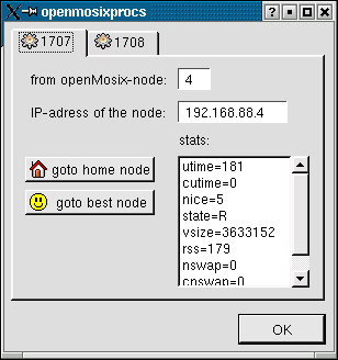 The openMosixview-migrator window displays all nodes in your openMosix-cluster. This window is for managing one process (with additional status-information). By doubleclicking on an host from the list the process will migrate to this host. After a short moment the process-icon for the managed process will be green, which means it is running remote.
