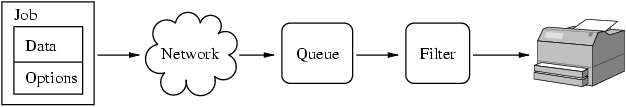 The spooling system copies the job and the options over the network in the general direction of the printer.