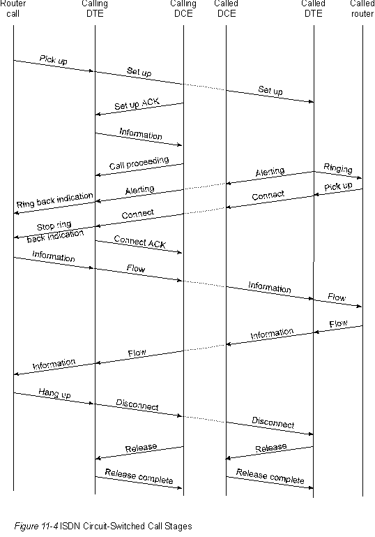Для передачи сигналов ISDN используются две спецификации Уровня 3: CCITT 1.450 (известная также как CCITT Q.930) и CCITT 1.451 (известная также как SSITT Q.931). Вместе оба этих протокола обеспечивают соединения пользователь-пользователь, соединения с коммутацией каналов и с коммутацией пакетов. В них определены разнообразные сообщения по организации и завершению обращения, информационные и смешанные сообщения, в том числе SETUP (УСТАНОВКА), CONNECT (ПОДКЛЮЧАТЬ), RELEASE (ОТКЛЮЧЕНИЕ), USER INFORMATION (ИНФОРМАЦИЯ ПОЛЬЗОВАТЕЛЯ), CANCEL (ОТМЕНА), STATUS (СОСТОЯНИЕ) и DISCONNECT (РАЗ'ЕДИНЯТЬ). Эти сообщения функционально схожи с сообщениями, которые обеспечивает протокол Х.25 (более подробно смотри в Главе 13 "Х.25"). На рис.11-4, взятом из спецификации CCITT 1.451, показаны типичные стадии обращения с коммутацией каналов ISDN.