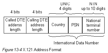 Поля адресации в пакетах установления обращения обеспечивают адреса DTE источника и пункта назначения. Они используются для организации виртуальных цепей, включающих передачу Х.25. Recommendation Х.121 CCITT определяет форматы адресов источника и пункта назначения. Адреса Х.121 (называемые также International Data Numbers, или IDN) имеют разную длину, которая может доходить до 14 десятичных знака. Четвертый байт в пакете организации обращения определяет длину адресов DTE источника и назначения. Первые четыре цифры IDN называются "код идентификации сети" - data network identification code - (DNIC). DNIC поделен на две части; первая часть (3 цифры) определяет страну, где находится PSN, вторая часть определяет саму PSN. Остальные цифры называются "номером национального терминала" - national terminal number - (NTN); они используются для идентификации определенного DTE в сети PSN. Формат адреса Х.121 представлен на Рис. 13-4.