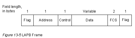 Спецификация Х.25 составляет схемы Уровней 1-3 эталонной модели OSI. Уровень 3 Х.25 описывает форматы пакетов и процедуры обмена пакетами между равноправными об'ектами Уровня 3. Уровень 2 Х.25 реализован Протоколом Link Access Procedure, Balanced (LAPB). LAPB определяет кадрирование пакетов для звена DTE/DCE. Уровень 1 Х.25 определяет электрические и механические процедуры активации и дезактивации физической среды, соединяющей данные DTE и DCE. Это взаимоотношение представлено на Рис. 13-2. Необходимо отметить, что на Уровни 2 и 3 также ссылаются как на стандарты ISO - ISO 7776 (LAPB) и ISO 8208 (пакетный уровень Х.25).