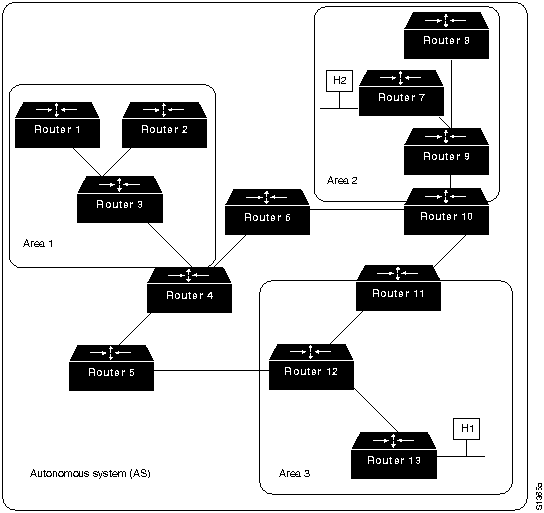 На этом рисунке роутеры 4, 5, 6, 10, 11 и 12 образуют стержень. Если хост Н1 Области 3 захочет отправить пакет хосту Н2 Области 2, то пакет отправляется в роутер 13, который продвигает его в роутер 12, который в свою очередь отправляет его в роутер 11. Роутер 11 продвигает пакет вдоль стержня к роутеру 10 границы области, который отправляет пакет через два внутренних роутера этой области (роутеры 9 и 7) до тех пор, пока он не будет продвинут к хосту Н2.