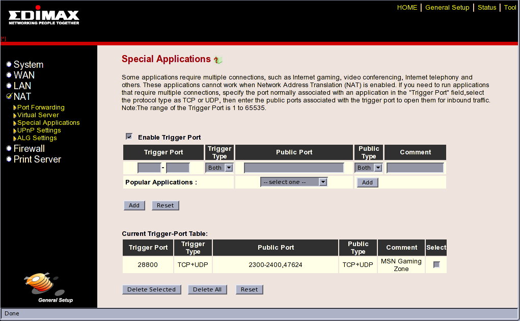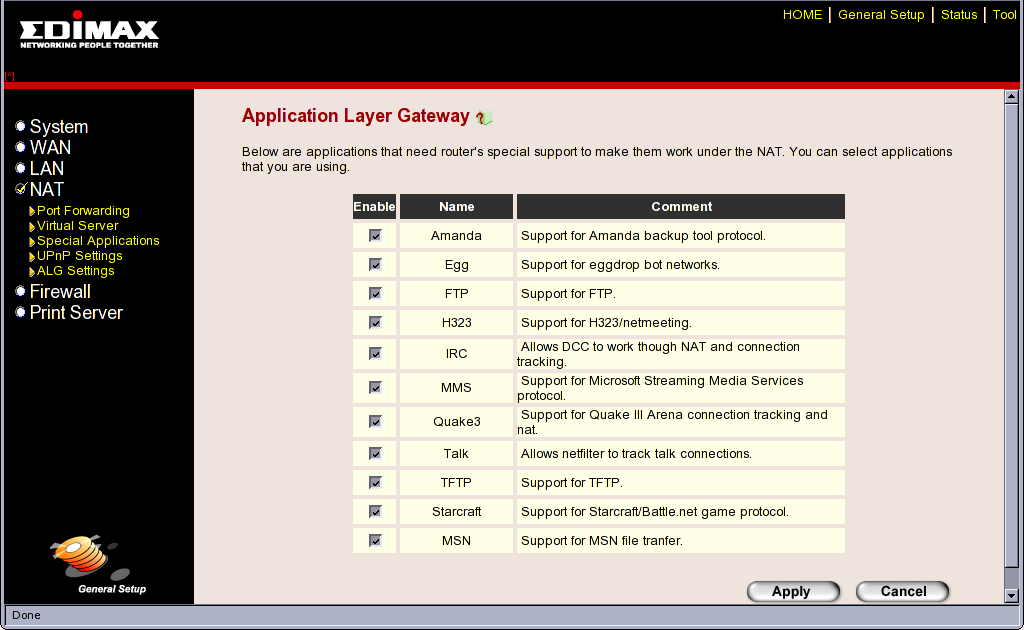 Маршрутизатор позволяет использовать специальные приложения (H.323, IRC, MSN, MMS, PPTP, Quake3, starcraft, tftp и другие).