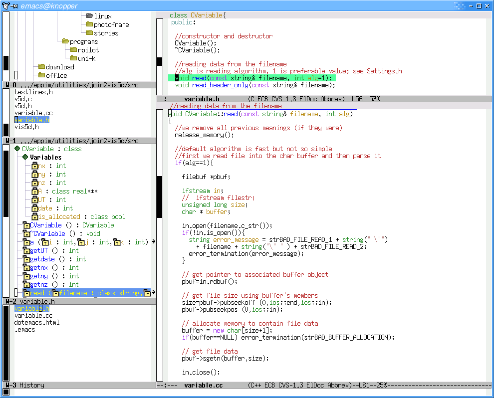 Это чудо мне посоветовали на ЛОРе, когда я плакал о том, как мне не хватает возможностей Visual C. И я нашел там много удобств, которые мне так нравились в майкрософтовской среде. Вместе с другими возможностями самого редактора GNU Emacs получается прекрасная среда для программирования. Кроме того, эту систему я использую для работы в LaTeX и при написании HTML.