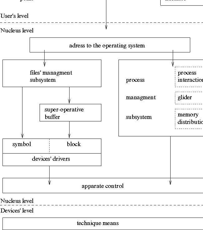 Из рисунка видно, что совокупность обращений к операционной системе разделена на те обращения, которые взаимодействуют с подсистемой управления файлами, и те, которые взаимодействуют с подсистемой управления процессами. Файловая подсистема управляет файлами, размещает записи файлов, управляет свободным пространством, доступом к файлам и поиском данных для пользователей. Данная подсистема обращается к данным, которые хранятся в файле, используя буферный механизм, управляющий потоком данных между ядром и устройствами внешней памяти. Буферный механизм, взаимодействуя с драйверами устройств ввода-вывода блоками, инициирует передачу данных к ядру и обратно.