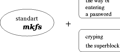 Для того, чтобы ext2_crypt можно было пользоваться, необходимо реализовать способ создания такой файловой системы, способ ее монтирования, а также необходимо внести изменения в систему ext2, благодаря которым будет осуществляться механизм распознавания пароля и шифрования содержимого файловой системы. Под реализацией способа создания файловой систем подразумевается модификация стандартной mkfs (Рис. 4)