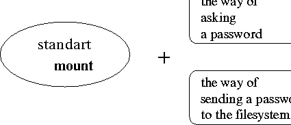 Как показано на рисунке, к старой реализации mount добавлен механизм запроса пароля, при правильности которого происходит монтирование, а также способ передачи пароля файловой системе. Под способом передачи пароля файловой системе подразумевается добавление пароля к списку опций, которые, в свою очередь, передаются файловой системе на дальнейшую обработку.