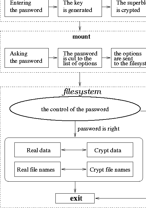 Из рисунка видно, что в новой реализации mkfs добавлен механизм запроса пароля, генерация по этому паролю ключа, а также шифрование суперблока с помощью сгенерированного ключа. Пароль, который вводится при создании файловой системы и является тем ключевым словом, которое необходимо будет ввести при монтировании для получения доступа к содержимому файлов. Из того, что при создании системы шифруется суперблок, вытекают два момента, выгодных с точки зрения защиты данных: во-первых, из того, что суперблок хранится на диске в зашифрованном виде следует, что систему невозможно смонтировать, какой бы тип файловой системы не был бы указан; во-вторых при монтировании с помощью расшифровывания суперблока осуществляется механизм распознавания пароля на правильность. Распознавание правильности пароля происходит следующим образом: при монтировании по введенному паролю генерируется ключ, с помощью которого происходит расшифровывание суперблока. В суперблоке есть поле s_magic, которое является ничем иным, как хранилищем так называемой ``магической'' константы, которая у каждой системы оригинальна, то есть в этом поле суперблока различных файловых систем хранятся различные константы. После того, как суперблок расшифрован, s_magic расшифрованного суперблока сравнивается с раз и навсегда заданной для ext2_crypt ``магической'' константой EXT2_CRYPT_SUPER_MAGIC, которая равна 0xFA53. Если совпадение имеет место, то монтирование разрешается, иначе -- нет.