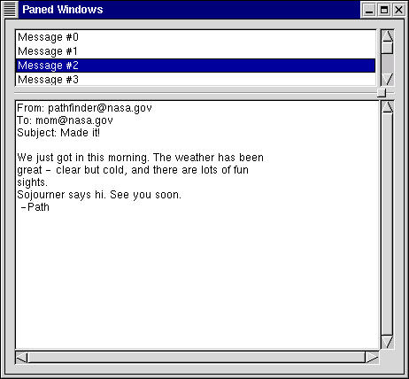 As an example, we will create part of the user interface of an imaginary email program. A window is divided into two portions vertically, with the top portion being a list of email messages and the bottom portion the text of the email message. Most of the program is pretty straightforward. A couple of points to note: text can't be added to a Text widget until it is realized. This could be done by calling realize(), but as a demonstration of an alternate technique, we connect a handler to the 'realize' signal to add the text. Also, we need to add the 'shrink' option to some of the items in the table containing the text window and its scrollbars, so that when the bottom portion is made smaller, the correct portions shrink instead of being pushed off the bottom of the window.