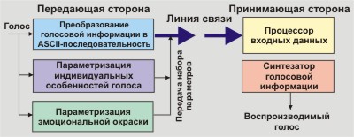 Рис. 6. Схема возможного снижения требуемой полосы пропускания при передаче голоса Символьное отображение голоса приводит к потере индивидуальных особенностей говорящего и эмоциональной окраски его речи. Системы распознавания людей по голосу уже существуют. Индивидуальные особенности голоса вещь достаточно стабильная. Если произвести анализ голоса конкретного человека и параметризовать эти особенности, то их можно будет использовать в дальнейшем в течение длительного времени. Если набор этих параметров записать на телефонную магнитную карту, то этой картой не сможет воспользоваться никто другой. Передача этих данных принимающей стороне может производиться в процессе установления телефонного соединения. В принципе можно параметризовать и эмоциональную окраску речи говорящего, но в этом случае это нужно делать в реальном масштабе времени. Реализация предлагаемой схемы будет приводить к дополнительным задержкам, но при использовании быстродействующих процессоров эти задержки можно минимизировать. Снижение требуемой полосы пропускания вместе с повсеместным внедрением протоколов RTP и RSVP сделает беседу через Интернет общедоступной. 2. Электронные книги и сфера развлечений. Если индивидуальные особенности голоса и эмоциональная окраска факторизованы, появляется возможность сделать плейеры, которые будут воспроизводить текст голосом определенного актера. Это потребует разработки специального языка разметки текста (вроде HTML) с учетом требуемой эмоциональной окраски. В этом случае на одном CD можно записать целую библиотеку. Мало того, что появляется возможность заказывать программу телепередач на неделю вперед, получать различную справочную информацию, в принципе могут стать доступными многосюжетные фильмы, где сценарий адаптируется под вкус и желание зрителя (такие фильмы уже снимаются). Зритель может вмешиваться по ходу фильма и направлять линию сценария по одному из нескольких возможных путей. Сети Интернет открывают новые возможности для интерактивных сетевых развлечений. Ограничения здесь иногда возникают лишь из-за полосы пропускания каналов. Развитие технологии виртуальной реальности будет еще более разнообразить возможности сетевых развлечений.
