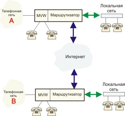 Рис. 4. Схема IP-телефонной сети На рисунке MVW-модуль (Multiflex Voice/WAN), включаемый в маршрутизатор, например, CISCO-3662, служит для связи с общедоступной телефонной сетью. Если сеть "А" размещена в Рио-де-Жанейро, а "В" в Москве, то любой клиент нижней сети сможет разговаривать с клиентом в Рио "бесплатно", а с клиентами телефонных сетей "А" и "B" по локальным тарифам. В левой части рисунка показаны телефонные аппараты, которые подключаются непосредственно к сегменту локальной сети. Такие приборы уже поступили в продажу. Грядет интеграция цифрового телевидения, телефонии (включая видео-телефонию) и Интернет, звуковые и видео письма уже реальность. Схема построения интерактивной сети цифрового кабельного телевидения показана на рис. 5.
