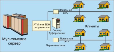 Рис. 5. Схема реализации интерактивного цифрового телевидения Данная схема, реализованная в США и Канаде несколько лет назад, позволяет клиентам индивидуально заказывать программу телевидения на неделю вперед. Помимо этого в режиме меню можно получить данные о погоде, состоянии дорог, заказать билеты в театр или на самолет, а также вызвать на экран нужную статью какой-то газеты. Заказанные фильмы копятся в сервере буферизации и в требуемое время транслируются для клиента-заказчика. Существующая инфраструктура кабельного телевидения в США вполне пригодна для решения таких задач. В реальном масштабе времени здесь передаются только новости и спортивные соревнования. Помимо ставшей уже привычной электронной почты Интернет дал нам WEB-технологию, глобальные поисковые системы, электронные журналы, оперативный доступ к прессе, электронную торговлю и многое другое. Молодые люди объясняются в любви по электронной почте, в реальном масштабе времени общаются с людьми на других континентах, играют в шахматы с партнерами из других стран. Все шире внедряются IP- и ISDN видео конференции. Перспективы 1. IP-телефония. IP-телефония уже сегодня теснит традиционную не только потому, что может предложить новые разновидности услуг, но и за счет снижения тарифов. В настоящее время внедряются протоколы RTP, RTCP и RSVP, которые вместе с расширением полосы пропускания магистральных каналов уберут последние барьеры на пути внедрения этой технологии. Можно вполне ожидать дальнейшего снижения требований, налагаемых на полосы пропускания, для реализации одного разговора. Там, где достаточно донести до партнера текст сообщения (например, пейджерная связь), можно реализовать распознавание и преобразование сообщения в ASCII-последовательность, что снизит требования к полосе пропускания в сотни раз. Еще большего эффекта можно достичь, используя схему, показанную на рис. 6 (технологии для этого по большей части уже существуют, но схема пока не реализована).