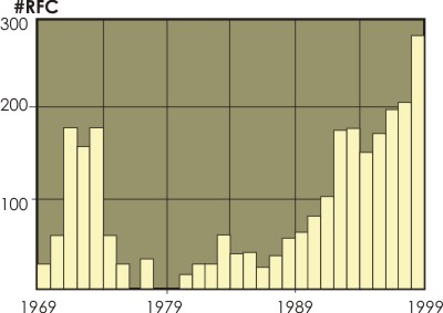 Если считать началом Интернет реализацию проекта ARPA-Net, то время его существования насчитывает более 31 года. Ведь в 1969 году был подготовлен документ RFC-1. Замечу, что протоколы Ethernet были сформированы лишь в 1973-79 годах. Интернет в РФ на 20 лет моложе. Динамику развития этой технологии можно проследить по темпу выпуска RFC (смотри рис. 1). В 2000 году ожидается не менее 250 публикаций.