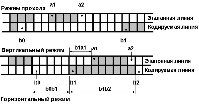 Рис. 2.5.1. Режимы кодирования: проходной; вертикальный; горизонтальный Факс-оборудование группы 4 может поддерживать так называемый расширенный режим, когда часть рабочего поля кодируется без использования алгоритмов уплотнения информации (как правило, это участки, где попытка сжать либо ничего не дает, либо даже приводит к увеличению объема передаваемых данных). Оборудование этой группа использует на канальном уровне процедуры HDLC LAPB. Рекомендуемой полосой пропускания канала, к которому подключается такое оборудование, является 64 Кбит/с. Таблица 2.5.1. Кодирование элементов изображения