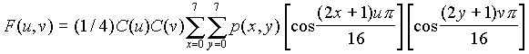 где v - горизонтальная координата графического блока, u - вертикальная, x - вертикальная координата внутри блока, а y - горизонтальная координата внутри блока, C(u), C(v) = 1/