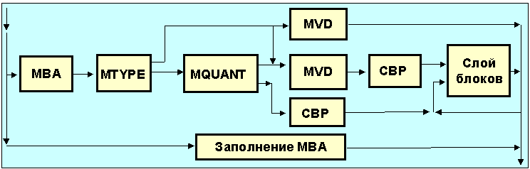 Рис. 2.5.5. Блок-схема кодирования и передачи изображения Макроблоки не передаются, если данная часть изображения не изменилась. За MBA следует код переменной длины Mtype, характеризующий формат макроблока (применен ли метод подвижного вектора MVD и т.д.) и последующую информацию. CBP (Coded Block Pattern) представляет собой кодовое слово переменной длины, которое несет в себе информацию о том, какой из шести блоков преобразования (8*8) содержит коэффициенты (слой блоков). CBP нужно не для всех типов макроблоков. Каждый блок завершается флагом EOB (End of Block).
