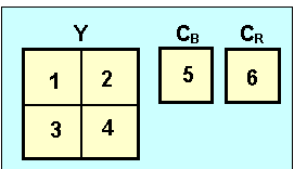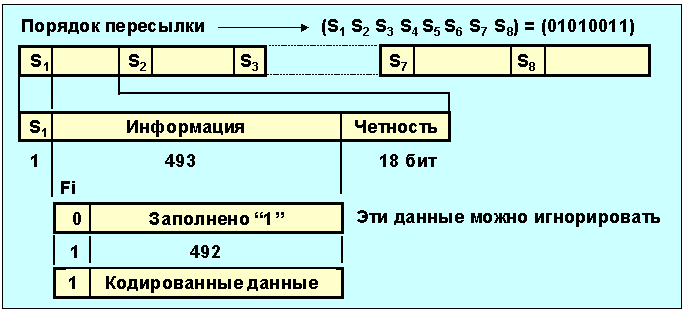 Рис. 2.5.6. Размещение блоков в макроблоках Сама природа алгоритма кодирования и передачи графических данных такова, что число бит передаваемых в единицу времени зависит от характера изображения. Чем динамичнее изменяется картинка, тем больше поток данных. Для выравнивания потока данных широко используется буферизация. Буферизация в свою очередь порождает дополнительные задержки, которые в случае видео-конференций или видео-телефонии не должны превышать нескольких сотен миллисекунд. Так как при передаче изображения широко используются коды переменной длины, она крайне уязвима для любых искажений. В случае ошибки будет испорчена вся информация вплоть до следующего стартового кода GoB. Из-за рекурсивности алгоритма формирования картинки, искажения будут оставаться на экране довольно долго. Использование векторов перемещения может привести к дрейфу искажений по экрану и расширению их области. Для того чтобы уменьшить последствия искажений, в передаваемый информационный поток включаются коды коррекции ошибок BCH (511,493; Forward Error Correction Code), которые позволяют исправить любые две ошибки или кластер, содержащий до 6 ошибок в блоке из 511 бит (см. рис. 2.5.7). Алгоритм работает в широком диапазоне скоростей передачи информации. Для реализации коррекции ошибок в поток двоичных данных включается 8 пакетов, каждый из которых включает в себя 1 кадровый бит, 1 бит индикатор заполнения, 492 бита кодированных данных и 18 бит четности. Поле Fi (индикатор заполнения) может равняться нулю, тогда последующие 492 бита не являются графической информацией и могут игнорироваться. Алгоритм предназначен для работы в динамическом диапазоне частот 40:1.