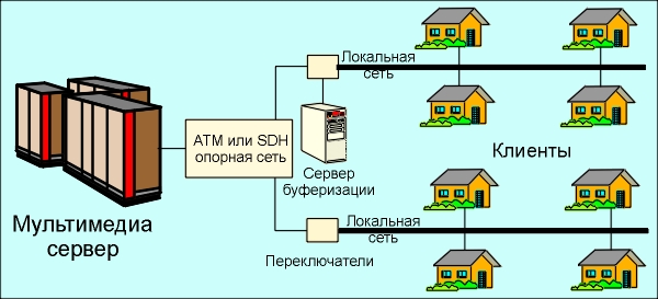 Рис. 2.5.9. Схема реализации интерактивного телевидения Базовый мультимедийный сервер может обслуживать отдельный район города. В пределах квартала размещается промежуточный центр, где размещается локальный буферный сервер, где записываются фрагменты программ, заказанные локальными клиентами. Только новостийные и некоторые спортивные программы передаются в реальном масштабе времени, все фильмы берутся из локальной фильмотеки или предварительно записываются в накопитель из центрального мультимедиа-сервера. Транспортной средой здесь может стать ATM, SDH или Fibre Channel. Оптическое волокно доходит до квартального сервера или даже до дома клиента. Индивидуальная раздача сигнала на терминалы (телевизоры) может осуществляться через существующие телевизионные кабели. В этом случае по имеющимся каналам может передаваться не только программа телевидения и осуществляться телефонные переговоры, но выполняться полное информационное обслуживание. Сюда может включаться, помимо заказа ТВ-программ, подписка на газеты, заказ билетов на транспорт или в театр, получение прогноза погоды и данных о состоянии дорог, доступ к базам данных, включая библиотеки и фонотеки и многое другое. Особый интерес представляет возможность практически полного вытеснения традиционных газет. Клиент сможет получать только интересующие его статьи из любых газет (и только их и оплачивать). Если какая-то статья его заинтересует и он захочет почитать ее позднее в машине или на даче, он сможет ее распечатать на принтере, подключенном к его телевизору-терминалу. Цены на цветные принтеры в настоящее время спустились ниже 100 долларов, таким образом нужная копия уже сейчас дешевле стоимости газеты. Экономия на бумаге и средствах доставки очевидны, да и необходимость в типографиях отпадет, ведь даже книги можно будет получить непосредственно дома (хотя привлекательность данной услуги и не вполне очевидна - хорошо сброшированная и переплетенная книга будет привлекательным объектом еще долго (прогноз относительно будущих книг сотри в разделе "Заключение"). Массовое внедрение таких технологий будет стимулировать падение цен на соответствующие процессоры и принтеры. Интерактивная схема подключения телевизора-терминала сделает возможным многие новые виды развлечений, а также выполнение многих покупок, не выходя из дома. Традиционной почте подписала отсроченный приговор почта электронная, но появление интерактивных широкополосных средств завершит многовековую историю почты (да и телеграфа). Ей будет оставлена доставка товаров, билетов и документов. Побочным продуктом прогресса в данной области станет общедоступный видеотелефон. В жилье клиента будет входить оптоволоконный кабель, завершающийся интерфейсной коробкой с разъемами для подключения телефона, телевизора и ЭВМ. Даже современные ограниченные скорости передачи позволяют решить стоящие проблемы. Во-первых люди не смотрят телевизор круглые сутки, это позволяет ночью или в рабочее время, когда клиент на службе, произвести передачу нужных фрагментов ТВ-программы на локальный сервер. Во-вторых популярность фильмов и программ не однородна, что также снижает требование на широкополосность. Известно, что наиболее популярный фильм запрашивается примерно в К раз чаще, чем фильм, занимающий к-ое место в сп