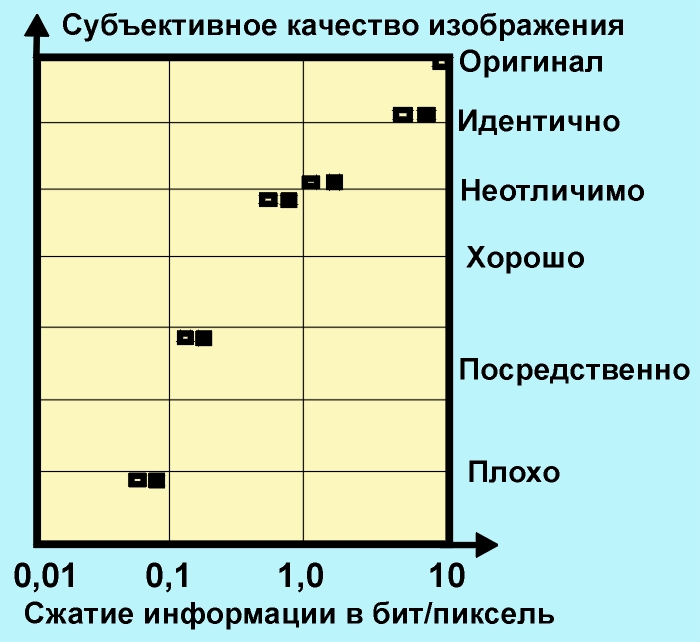 Рис. 2.5.3. Качество DCT-изображения для различных значений сжатия информации (картинка имеет разрешение 512*512 пикселей; заполненные квадратики соответствуют цветному изображению, а незаполненные - черно-белому) Отображение графического образа может выполняться последовательно (примерно так, как мы читаем текст: слева-направо и сверху-вниз) или с использованием прогрессивного кодирования (сначала передается вся картинка с низким разрешением, затем последовательно четкость изображения доводится до максимальной). Последний метод весьма удобен для систем WWW, где просмотрев изображение низкого разрешения, можно отменить передачу данных улучшающих четкость и тем самым сэкономить время. Хорошо распознаваемое изображение получается при сжатии порядка 0,1 бита на пиксель. Проблема сжатия и передачи движущегося изображения еще сложнее. Алгоритм кодирования такого изображения описан в рекомендациях CCITT H.261 и предполагает, что скорость передачи при этом лежит в интервале 40кбит/с - 2Мбит/с. Следует иметь в виду, что видео телефония и видеоконференции требуют синхронной передачи звука и изображения (стандарт H.221, например 46,4 Кбит/с для видео и 16 Кбит/с для звука). Нормальный формат телевидения имеет 625 и 525 строк развертки и частоту кадров 25-30 в секунду. Цветное телевидение использует сигналы R (red), G (green) и B (blue), причем яркость луча (y) определяется соотношением: Y = 0.30R + 0.59G + 0.11B (при отображении белого цвета). Информация о цветах определяется формулами: СB = B - Y и CR = R - Y. Зная величины y, CB и СR, можно восстановить значения R, G и B. При сжатии цветного изображения учитывается тот факт, что человеческий глаз извлекает большую часть информации из контуров предметов, а не из цветных деталей. Например в рекомендации CCIR 601 предлагается использовать полосу 13.5 Мгц для кодирования Y и только по 6.75 Мгц для СB и CR. Такая схема требует 216 Мбит/с, что в 3375 раза превышает возможности стандартного 64кбит/с B-канала ISDN. Приемлемыми решениями могут быть: