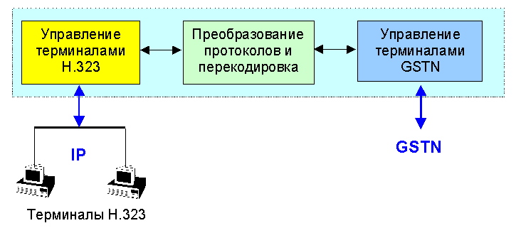 Рис. 2.9.4. Схема шлюза IP/GSTN Узел управления доступом (gatekeeper) является центральным блоком сети H.323. Через него проходят все запросы обслуживания, при этом он выполняет функцию виртуального переключателя. Узел управления доступом осуществляет преобразование имен терминалов и шлюзов в их IP и IPX-адреса в соответствии со спецификацией RAS. Например, если администратор сети установил верхний предел на число участников конференции, при достижении этого порога узел управления доступом может отказать в установлении соединения. Совокупность терминалов, шлюзов и блоков MTU, управляемая общим блоком доступа, называется зоной H.323. Узел управления доступом может опционно маршрутизовать запросы H.323. Разработчики иногда совмещают функции шлюза, MCU и узла управления доступом, возможно независимое совмещение функций MCU и узла управления доступом. К числу обязательных функций узла управления доступом относится.