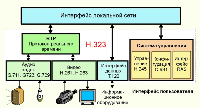 При видеоконференциях используется технология codec (coder/decoder) для выделенных и телефонных коммутируемых линий (>56 Кбит/с, интерфейс V35), применим и режим коммутации пакетов (multicast backbone, >256 Кбит/с). Перечень стандартов, регламентирующих протоколы видеоконференций можно найти в следующем разделе (2.9.1). Но базовым протоколом для работы в локальных сетях, где не гарантируется нужный уровень qos), является h.323 (1996-98 гг.; вторая дата относится к принятию версии 2). Этот стандарт обеспечивает видеоконференции для соединений точка-точка и для многоточечных топологий в рамках стека протоколов tcp/ip, он регламентирует и принципы сжатия видео и аудио информации. Привлекательность стандарта заключается в том, что он применим к уже существующей инфраструктуре телекоммуникаций с широкими вариациями задержек отклика. Способствует этому возрастающая пропускная способность локальных (fast ethernet и gigabit ethernet) и региональных сетей (SDH, ATM, FDDI, Fibre Channel и т.д.). Способствуют этому как новейшие протоколы из семейства IP - RTP и RSVP, так и поддержка H.323 такими компаниями как Intel, Microsoft, Cisco и IBM. H.323 не привязан ни к одной операционной системе и не предполагает использования какого-либо специализированного оборудования. На рис. 2.9.2 показана структура системы H.323 и основных ее компонентов.